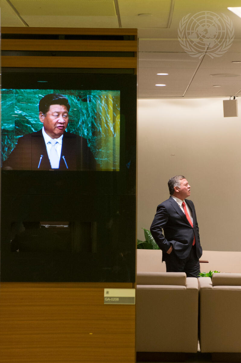 King Abdullah II ibn Al Hussein of the Hashemite Kingdom of Jordan ((right) waits to take the podium, as the speaker before him, Xi Jinping (shown on screen at left), President of the People’s Republic of China, addresses the general debate of the General Assembly’s seventieth session.