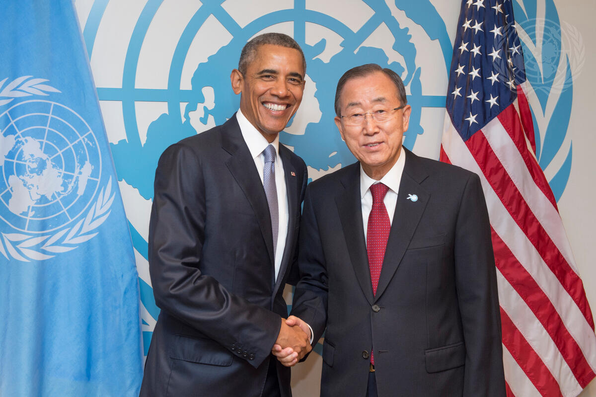 Secretary-General Ban Ki-moon (right) meets with Barack Obama, President of the United States.