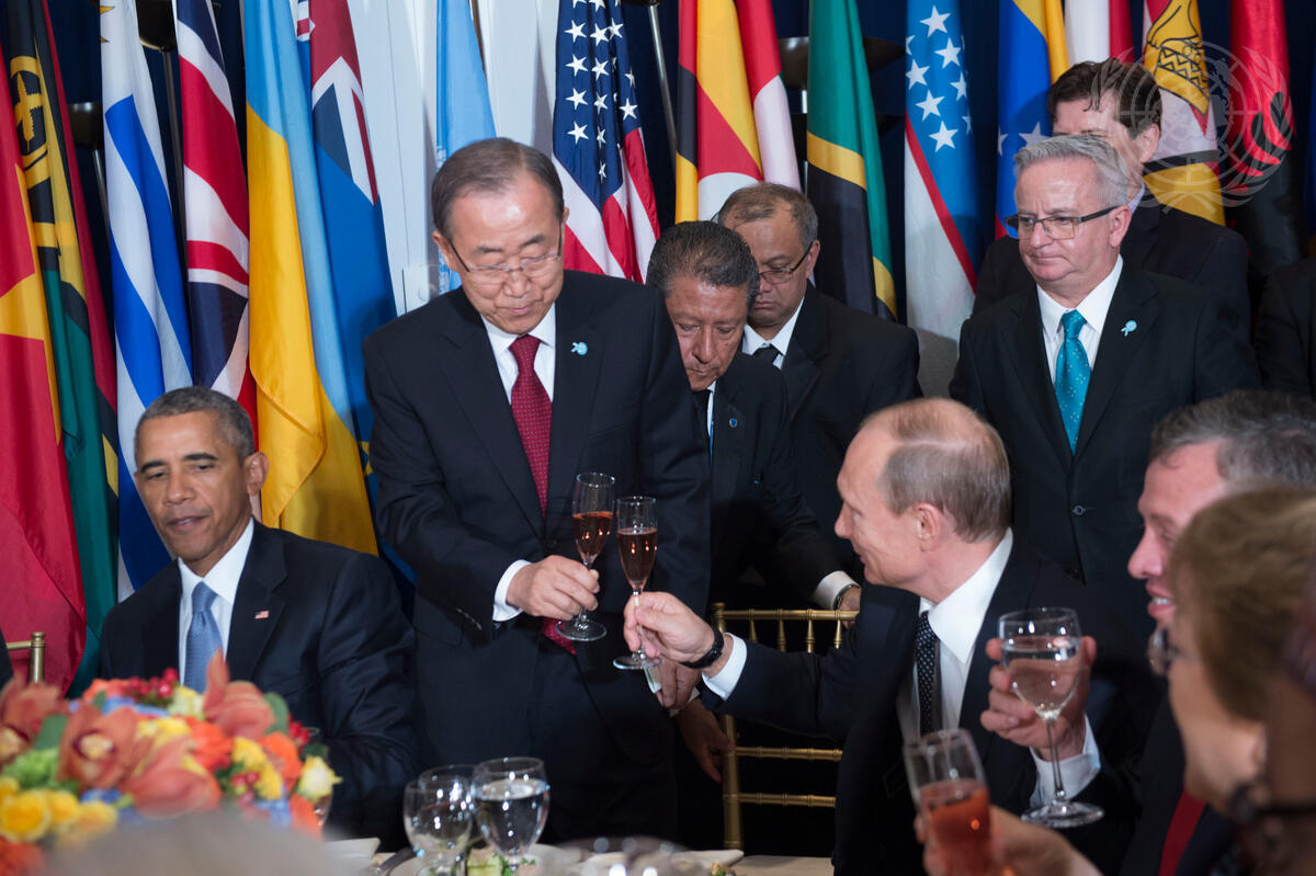 The Secretary-General shares a toast with Vladimir V. Putin, President of the Russian Federation, as United States President Barack Obama (left) looks on.