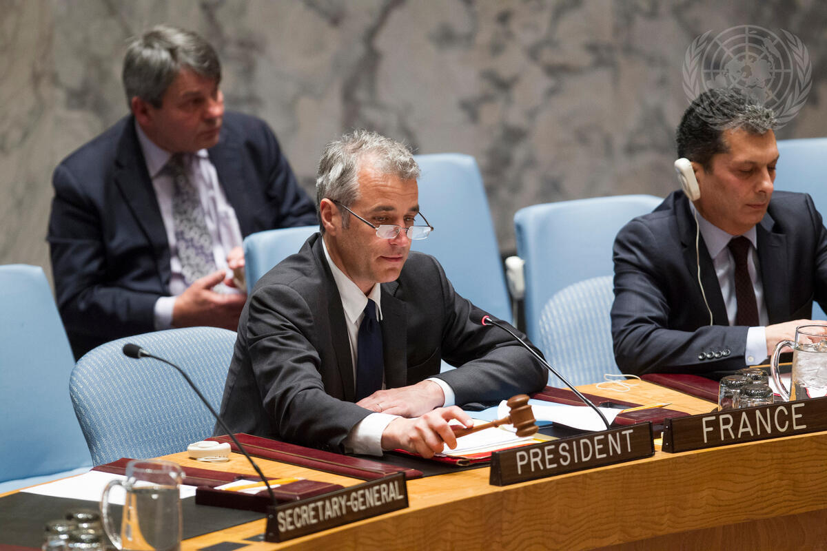Alexis Lamek, Deputy Permanent Representative of France to the UN, chairs the Security Council meeting on the situation in Syria, as President of the Council for the month of March.