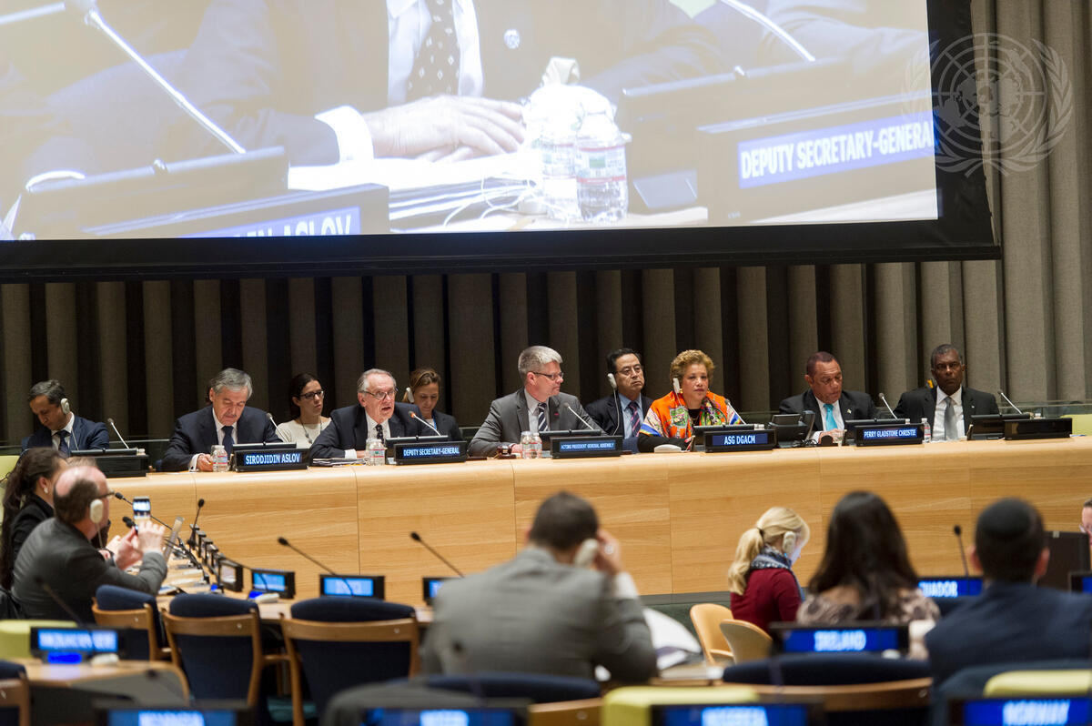 Deputy Secretary-General Jan Eliasson (second left) addresses the High-Level Interactive Dialogue on International Decade for Action, ‘Water for Life’, 2005-2015. Also pictured: Sirodjidin Aslov (left), Minister for Foreign Affairs of the Republic of Tajikistan; Einar Gunnarsson (third left), Permanent Representative of Iceland to the UN and Acting President of the sixty-ninth session of General Assembly; Catherine Pollard (third right), Assistant Secretary-General for the Department of General Assembly and Conference Management (DGACM); Perry Gladstone Christie (second right), Prime Minister of the Commonwealth of the Bahamas.