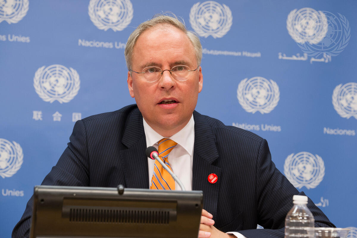 Karel Jan Gustaaf van Oosterom, Permanent Representative of the Kingdom of the Netherlands to the UN, addresses a press conference on the occasion of International Day for Mine Awareness and Assistance in Mine Action (4 April). Also briefing journalists with him were Yoshifumi Okamura, Deputy Permanent Representative of Japan to the UN; and Agnès Marcaillou, Director of the UN Mine Action Service (UNMAS), Department of Peacekeeping Operations.