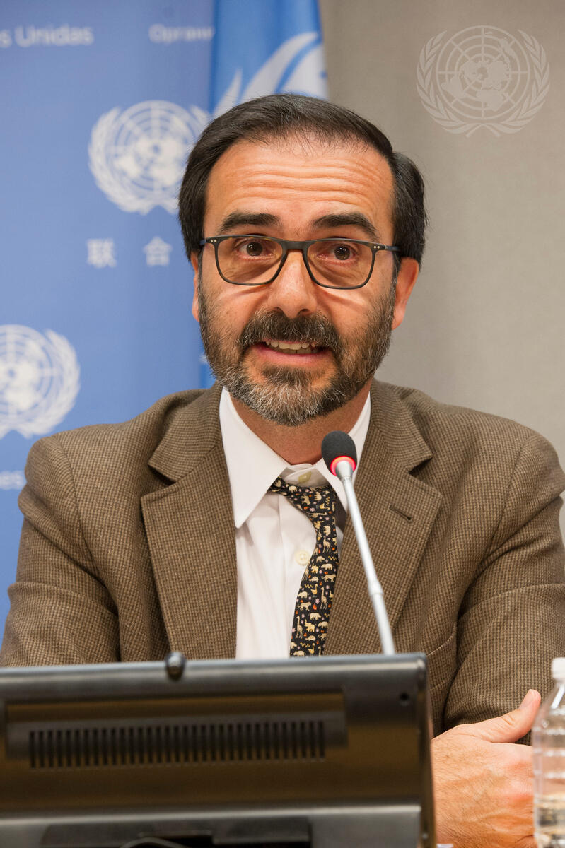 Renzo Pomi, Amnesty International Representative at the United Nations, addresses a press conference on Amnesty International's Death Penalty Report 2014. Also speaking to reporters with him was Gonzalo Koncke Pizzorno, Permanent Representative of Uruguay to the UN. The press conference was organized by the Permanent Mission of Uruguay to the UN.