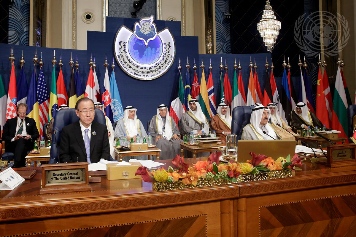 Secretary-General Ban Ki-moon (left on dais) with Sheikh Sabah Al-Ahmad Al-Jaber Al-Sabah (right on dais), Amir of the State of Kuwait, at the opening of Third International Humanitarian Pledging Conference for Syria, taking place in Kuwait City.