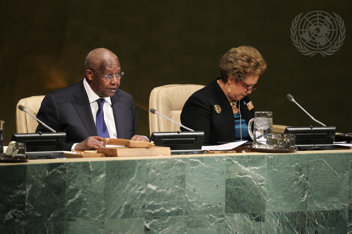 Sam Kutesa (left), President of the sixty-ninth session of the General Assembly, addresses the Assembly’s meeting commemorating the International Day of Remembrance for the Victims of Slavery and the Transatlantic Slave Trade (25 March). The theme for the commemoration was “Women and Slavery”. At right is Catherine Pollard, Assistant Secretary-General for General Assembly and Conference Management.
