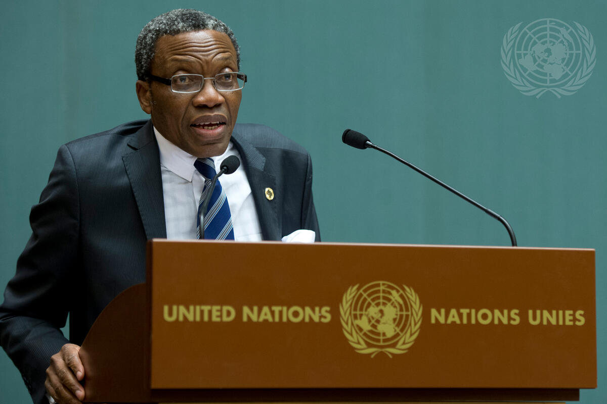 Jean-Marie Ehouzou, Permanent Representative of the African Union to the United Nations Office at Geneva (UNOG), addresses the meeting in observance of the International Day of Solidarity with the Palestinian People.