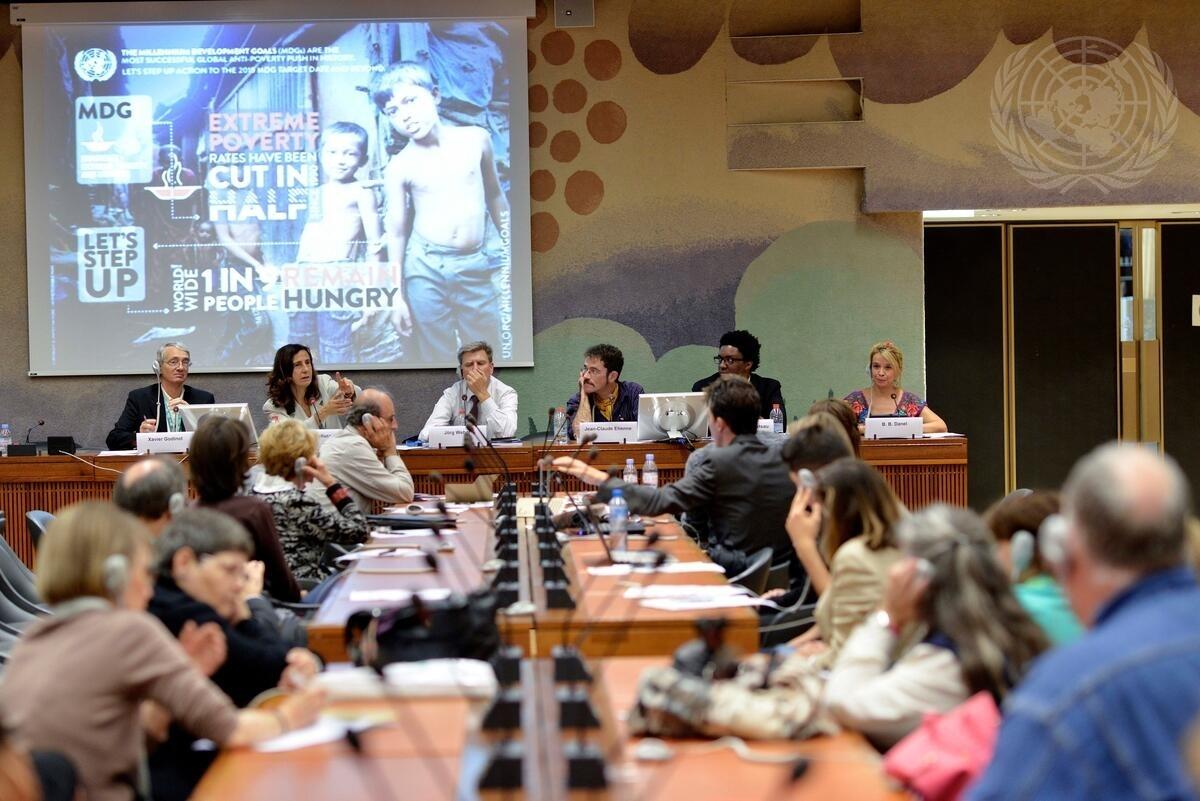 On panel from left: Xavier Godinot, economist and permanent volunteer of ATD Fourth World; Alessandra Vellucci, Chief of Press and External Relations at the UN Information Service in Geneva; Jörg Weber, Director of the Investment Policy Branch, Division for Investment and Enterprise in the UN Conference on Trade and Development (UNCTAD); Jean Claude Etienne, member of Collectif 17 Octobre; Neo Mothobi Matsau, CEO of Bamboo Innovation Ecosystem; and Beatriz Barreal Danel, Director General of Riviera Maya Sostenible.