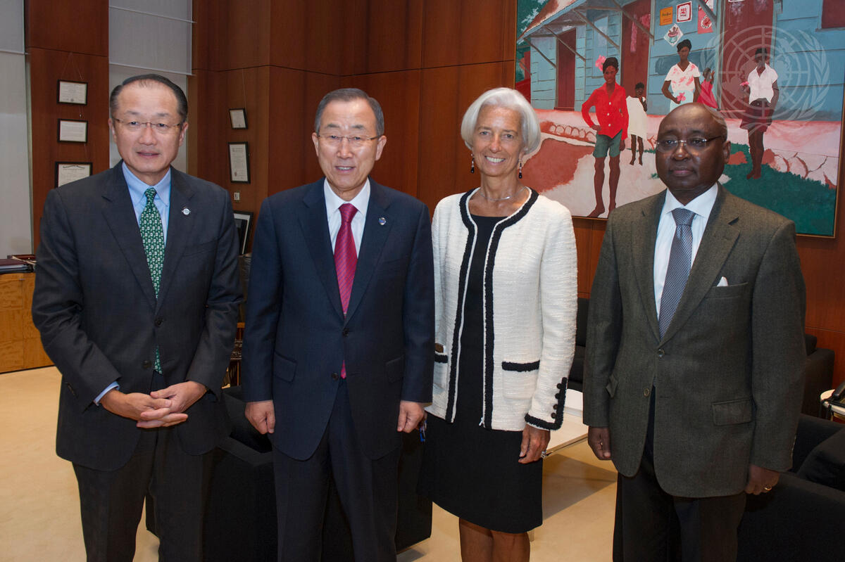 Caption Description Secretary-General Ban Ki-moon (centre left) meets with meets with (from left): Jim Yong Kim, President of the World Bank Group; Christine Lagarde, Managing Director of the International Monetary Fund (IMF); and Donald Kaberuka, President of the African Development Bank Group (AfDB), at World Bank Headquarters in Washington, D.C.