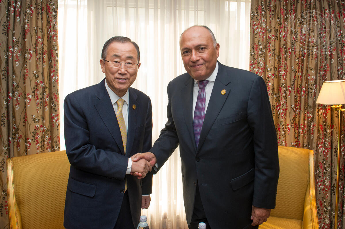 Secretary-General Ban Ki-moon (left) meets with Sameh Hassan Shokry Selim, Minister for Foreign Affairs of the Arab Republic of Egypt, in Cairo.