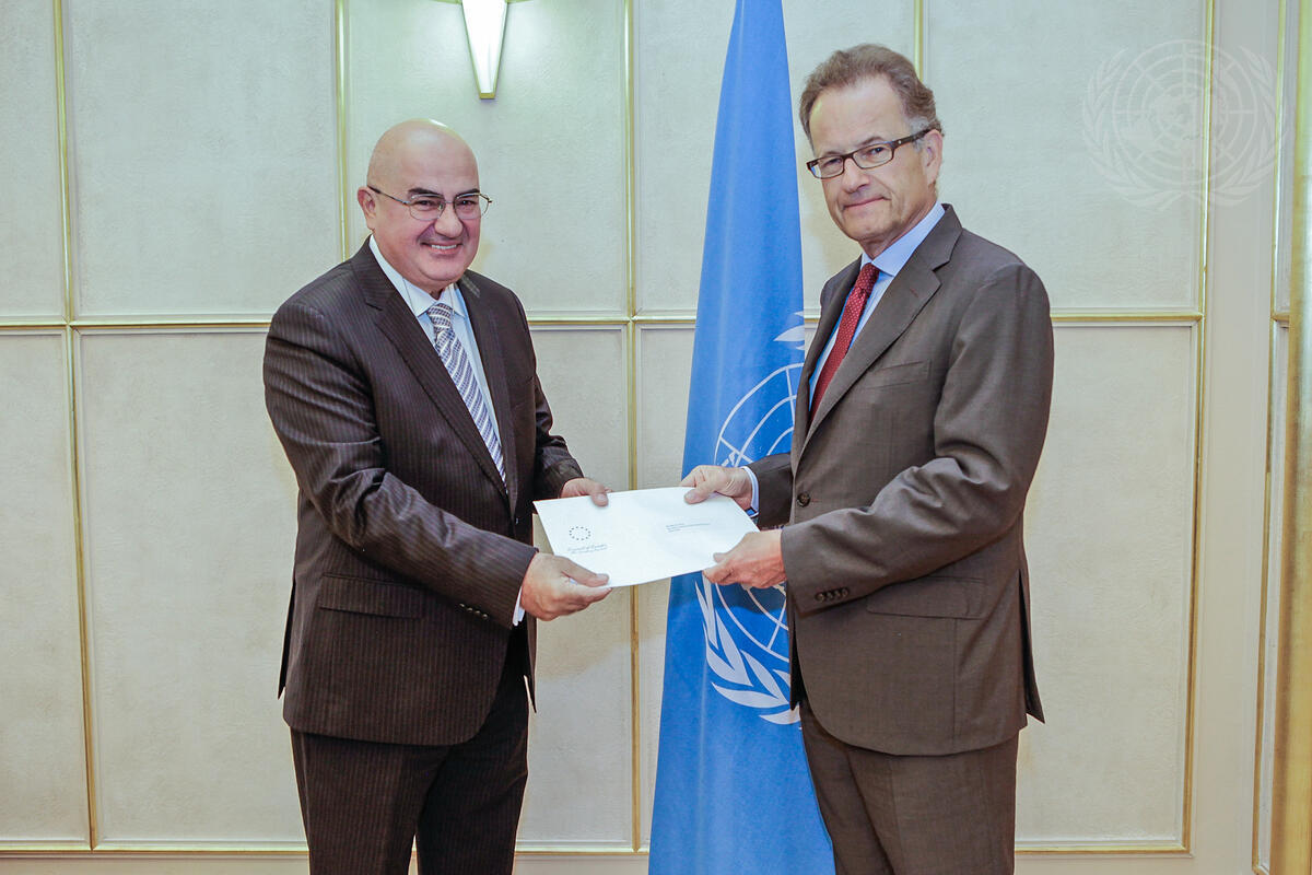 Murat Adali (left), new Permanent Observer of the Council of Europe to the United Nations Office at Geneva (UNOG), presents his credentials to Michael Møller, Acting Director-General of UNOG.
