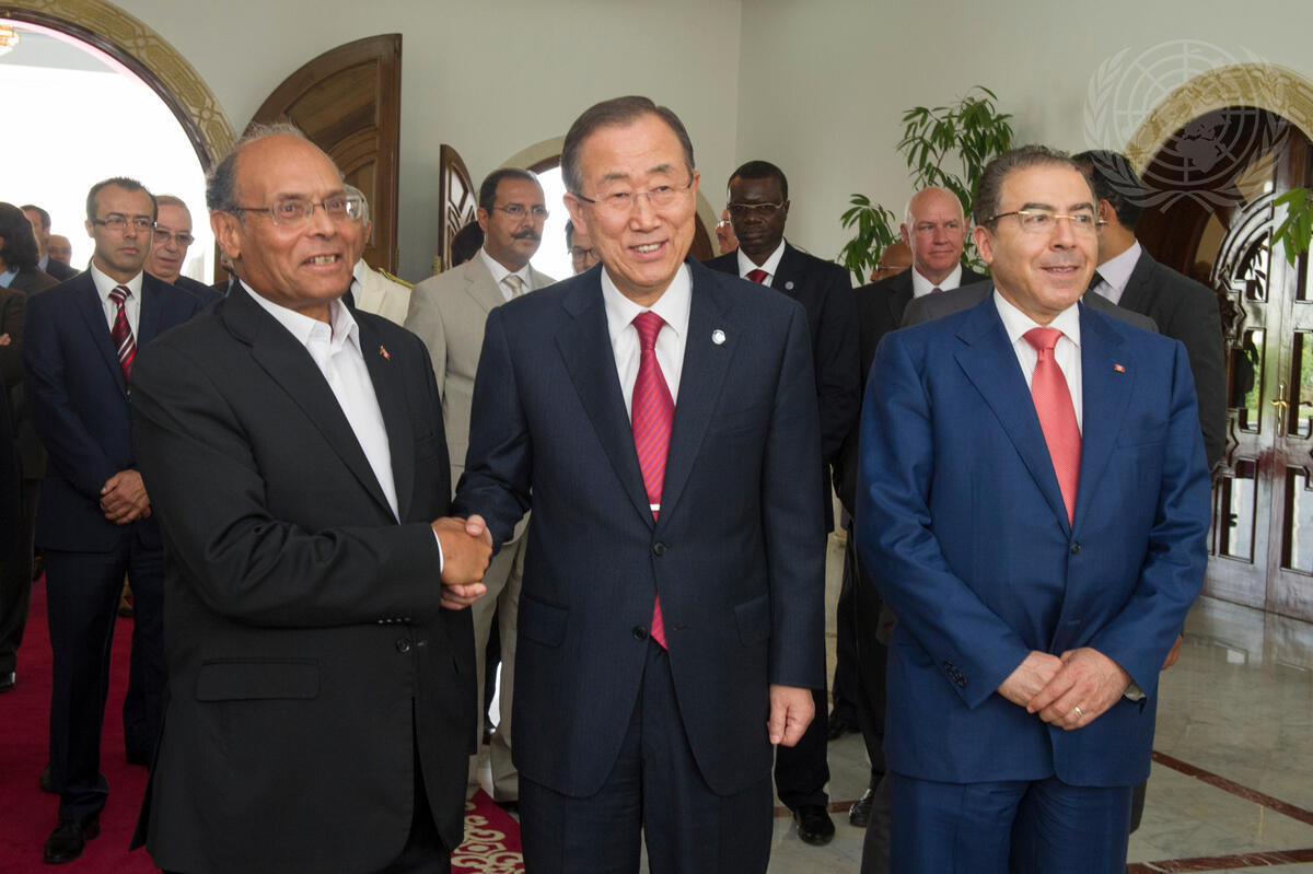 Secretary-General Ban Ki-moon (centre) with Mohamed Moncef Marzouki (left), President of the Republic of Tunisia, during Mr. Ban’s visit to Tunis.