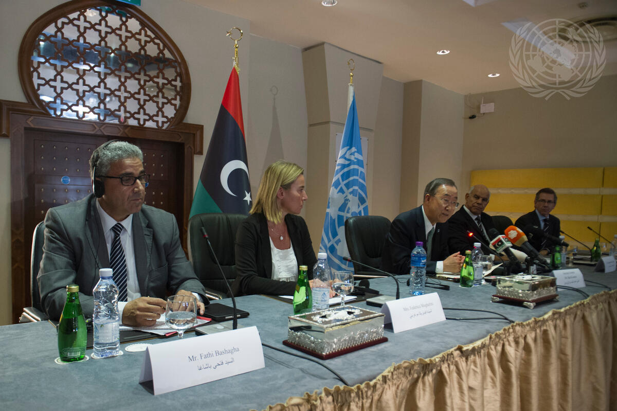Secretary-General Ban Ki-moon (centre) speaks at a meeting with Libyan representatives. Mr. Ban travelled to Libya with his Special Representative for Libya, Bernardino León (far right), and Federica Mogherini (second from left), Foreign Minister of Italy. Also present is Fathi Bashagha (left), Member of Parliament and head of Misrata delegation.