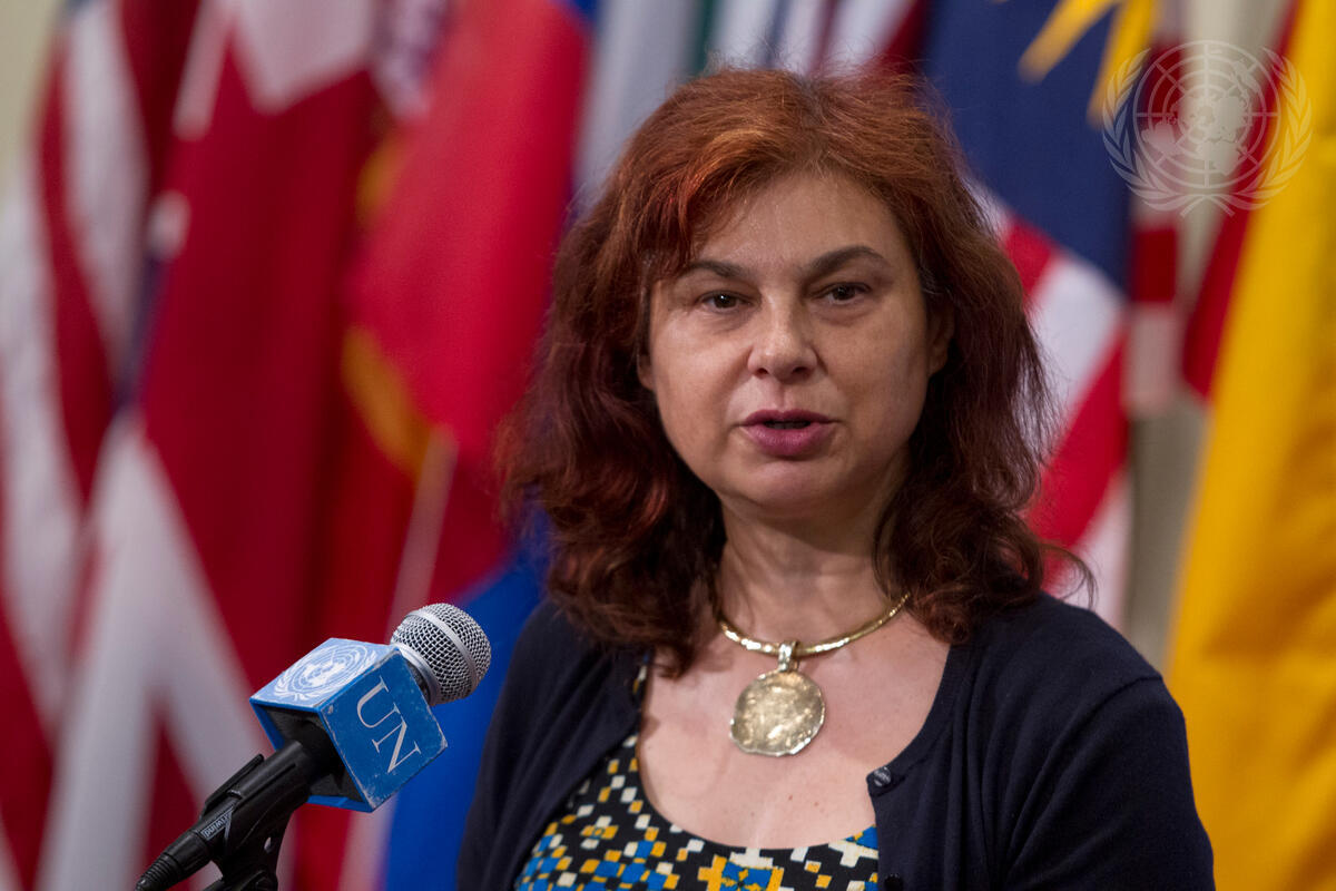 Raimonda Murmokaite, Permanent Representative of Lithuania to the UN and President of the Security Council for May, speaks to journalists, following a closed Council meeting on the situation in Syria.