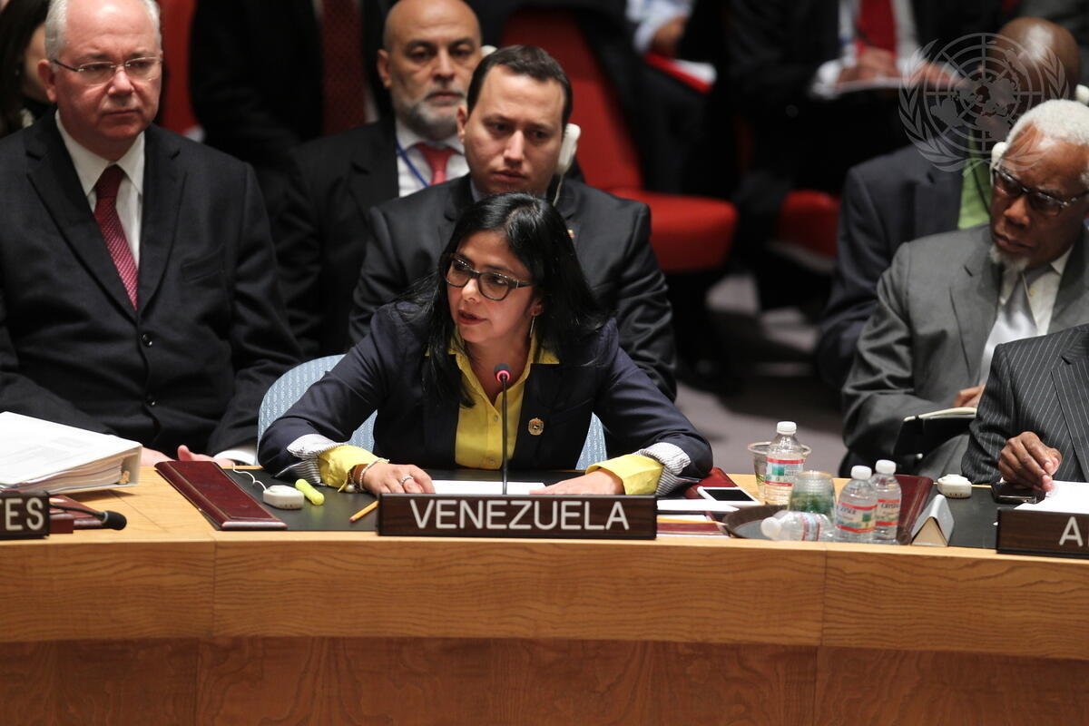Delcy Eloína Rodríguez Gómez (front centre), Minister for Foreign Affairs of the Bolivarian Republic of Venezuela, addresses the Security Council open debate on the theme, “Maintenance of international peace and security: Reflect on history, reaffirm the strong commitment to the purposes and principles of the Charter of the United Nations”.
