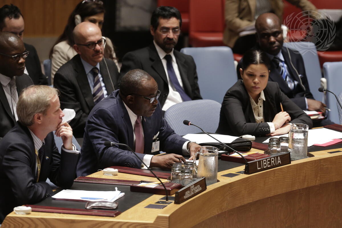 Benedict F. Sannoh (front centre), Minister of Justice and Attorney General of the Republic of Liberia, addresses the Security Council meeting on the situation in his country. On his right is Olof Skoog, Permanent Representative of Sweden to the UN and Chair of the Liberia Configuration of the Peacebuilding Commission.