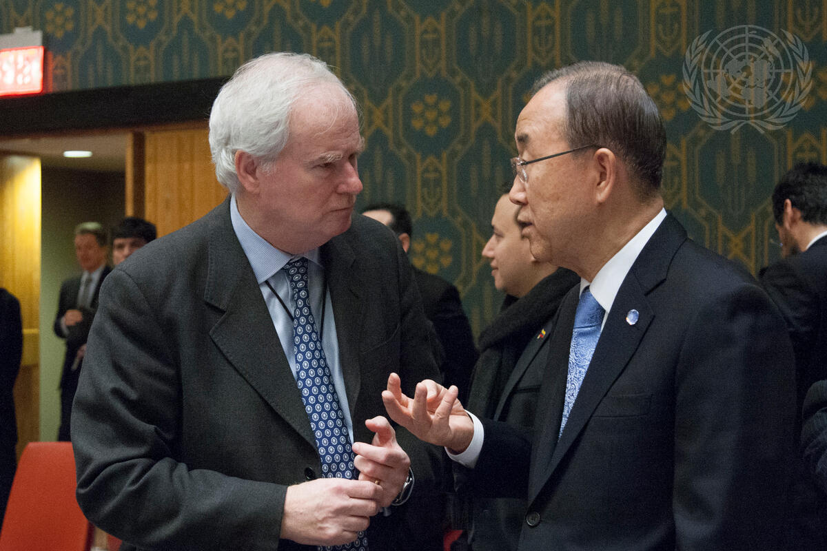 Secretary-General Ban Ki-moon (right) speaks with Mark Lyall Grant, Permanent Representative of the United Kingdom to the UN, at the Security Council open debate on the theme, “Maintenance of international peace and security: Reflect on history, reaffirm the strong commitment to the purposes and principles of the Charter of the United Nations”.