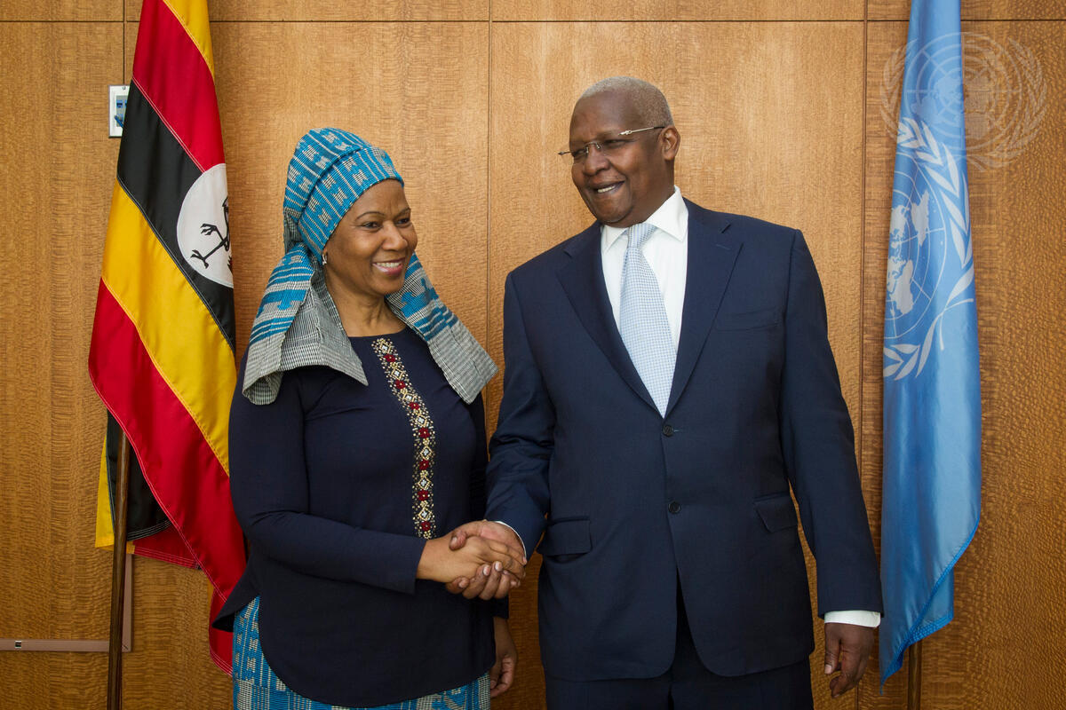 Sam Kutesa (right), President of the sixty-ninth session of the General Assembly, meets with Phumzile Mlambo-Ngcuka, Executive Director of the United Nations Entity for Gender Equality and the Empowerment of Women (UN Women).