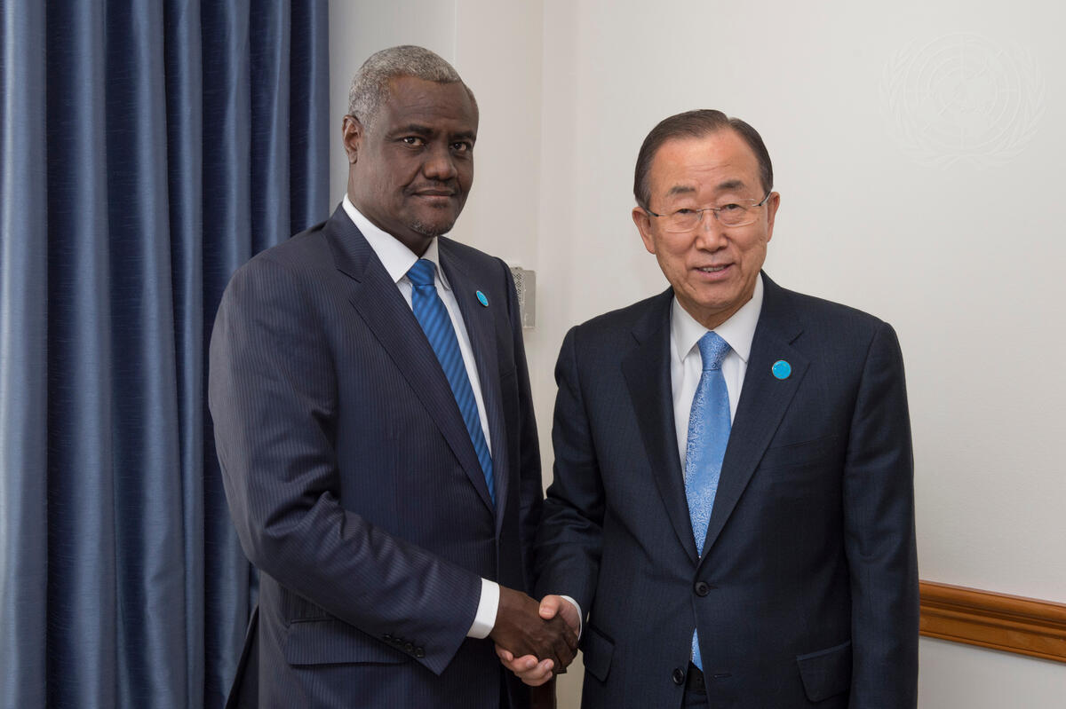 Secretary-General Ban Ki-moon (right) meets with Moussa Faki Mahamat, Minister for Foreign Affairs and African Integration of the Republic of Chad, in Washington, D.C.
