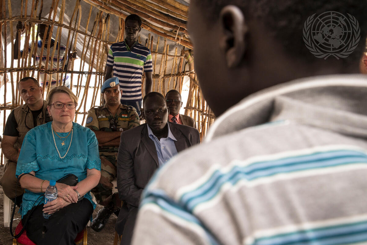 Ellen Margrethe Løj (left), Special Representative of the Secretary-General and Head of the UN Mission in South Sudan (UNMISS), speaks to one of the former child soldiers during her visit to the town of Pibor in Juba, South Sudan.