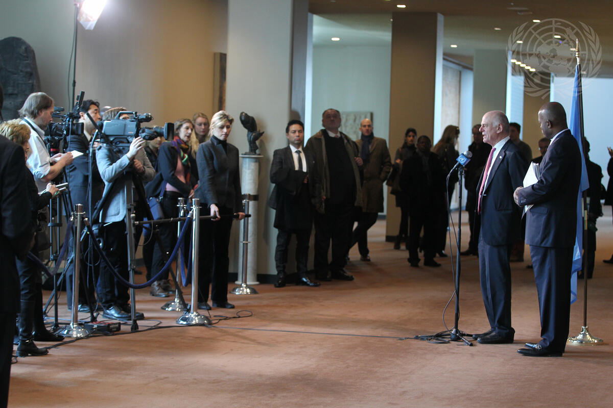 David Nabarro (second from right), Special Envoy of the Secretary-General on Ebola, speaks to journalists following a briefing to the General Assembly on the latest developments concerning the Ebola epidemic. At right is Jean Victor Nkolo, Spokesperson for the President of the sixty-ninth session of the General Assembly.