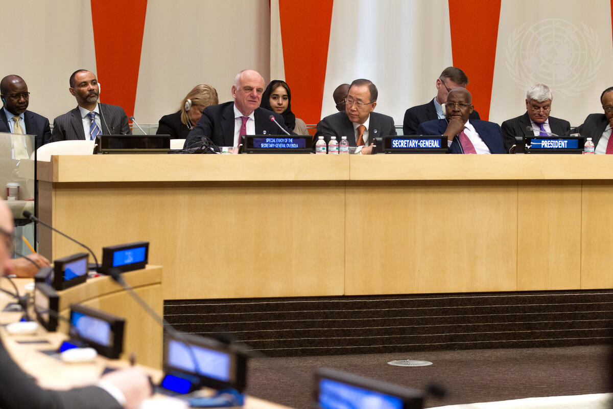 David Nabarro (left on dais), Special Envoy of the Secretary-General on Ebola, briefs the General Assembly on the latest developments concerning the Ebola epidemic. Also pictured on dais (from left): Secretary-General Ban Ki-moon and Sam Kutesa, President of the sixty-ninth session of the Assembly.