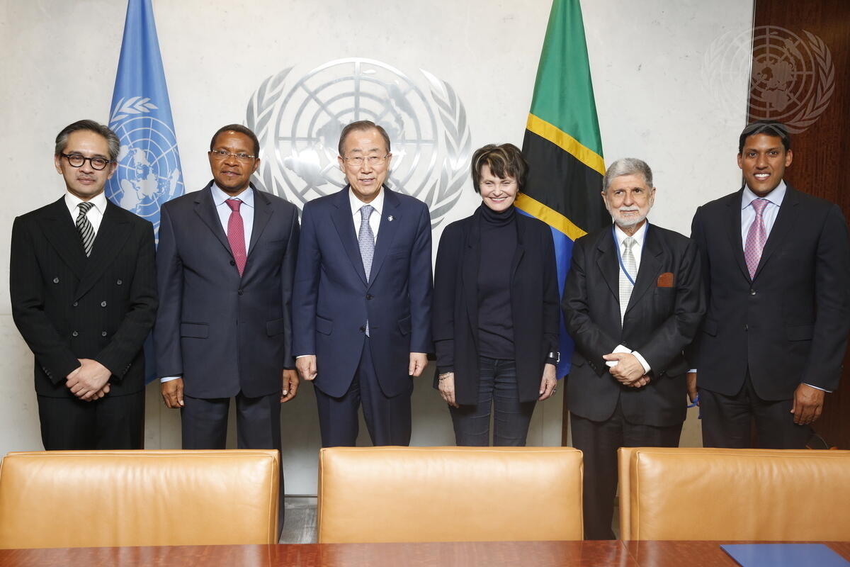 Secretary-General Ban Ki-moon (centre left) meets with members of his High-level Panel on the Global Response to Health Crises, including Jakaya Mrisho Kikwete (second from left), President of the United Republic of Tanzania and Chair of the Panel. From left: Marty M. Natalegawa, former Minister for Foreign Affairs of the Republic of Indonesia; Micheline Calmy-Rey, former President of Switzerland; Celso Luiz Nunes Amorim, former Minister of Defence and former Minister for External Relations of Brazil; and Rajiv Shah, former Administrator of the United States Agency for International Development (USAID).