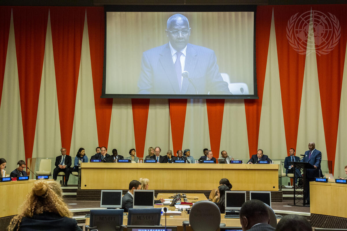 Sam Kutesa (at lectern on right and shown on screen), President of the sixty-ninth session of the General Assembly, makes his remarks at an informal session of the preparatory process for the third International Conference on Financing for Development.