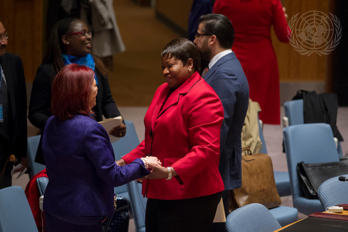 Fatou Bensouda (centre), Prosecutor of the International Criminal Court (ICC), greets María Cristina Perceval (left), Permanent Representative of Argentina to the UN and President of the Security Council for October, at the Council’s meeting on its own working methods.