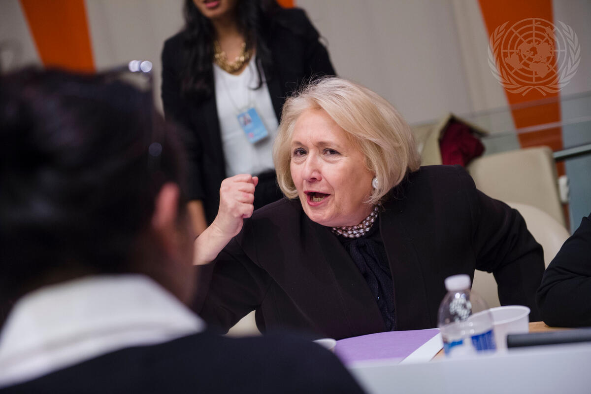 Melanne Verveer, Executive Director of the Georgetown Institute for Women, Peace and Security, interacts with participants before the panel discussion on “The Role of Women in Countering Violent Extremism”, organized by the Permanent Mission of the United Arab Emirates and the United Nations Entity for Gender Equality and the Empowerment of Women (UN Women).