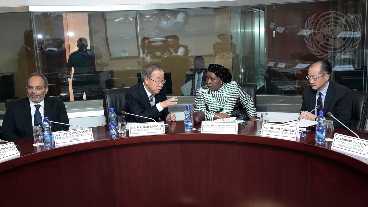 Secretary-General Ban Ki-moon (centre left) and World Bank President Jim Yong Kim (right), meet with Nkosazana Dlamini Zuma (centre right), Chairperson of the African Union Commission. Also pictured: Carlos Lopes, Executive Secretary of the UN Economic Commission for Africa.