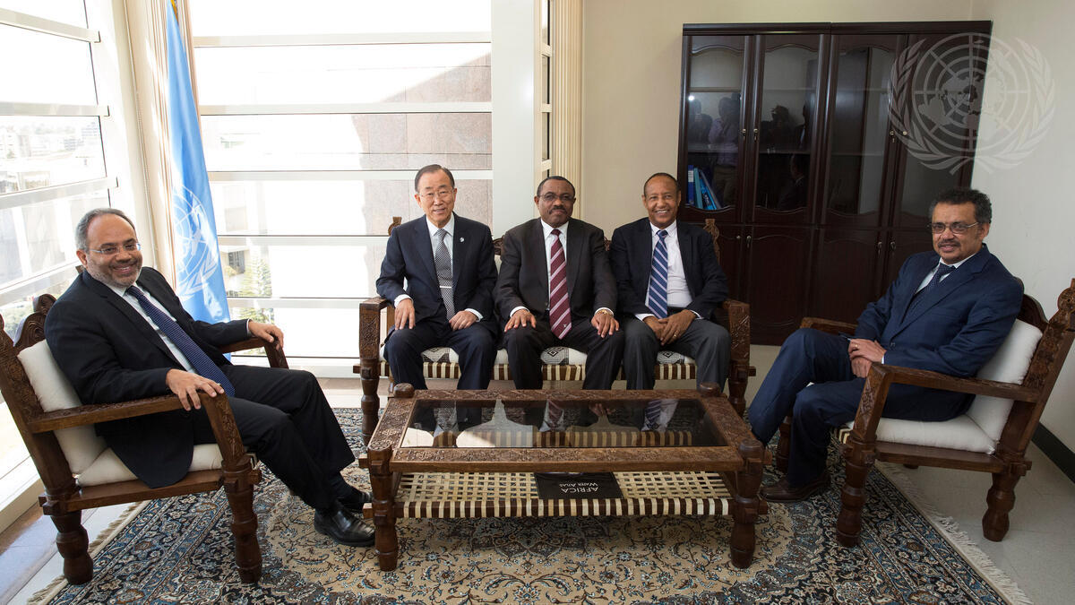 Secretary-General Ban Ki-moon (centre left) meets with Hailemariam Dessalegn (centre), Prime Minister of the Federal Democratic Republic of Ethiopia; and Tedros Adhanom Ghebreyesus (right), Minister for Foreign Affairs, in Addis Ababa. Also pictured: Carlos Lopes (left), Executive Secretary of the UN Economic Commission for Africa; and Haile Menkerios (centre right), Head of the United Nations Office to the African Union (UNOAU) and Special Representative to the African Union.