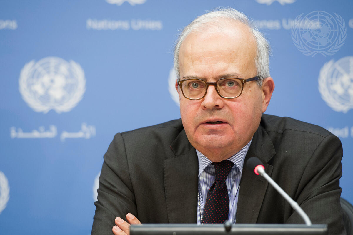 Emmanuel Decaux, Chair of the Committee on Enforced Disappearances, addresses a press conference on enforced or involuntary disappearances.