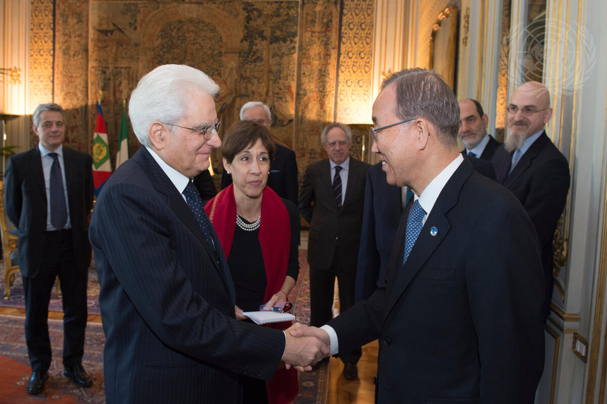 Secretary-General Ban Ki-moon (centre right) meets with Sergio Mattarella, President of Italy.