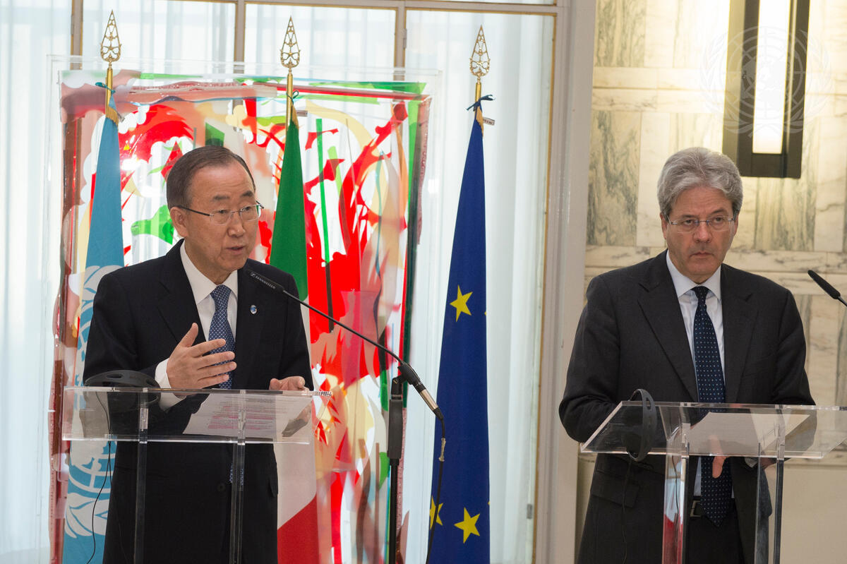 Secretary-General Ban Ki-moon (left) jointly addresses a press conference with Paolo Gentiloni (right), Minister for Foreign Affairs and International Cooperation of Italy, in Rome.