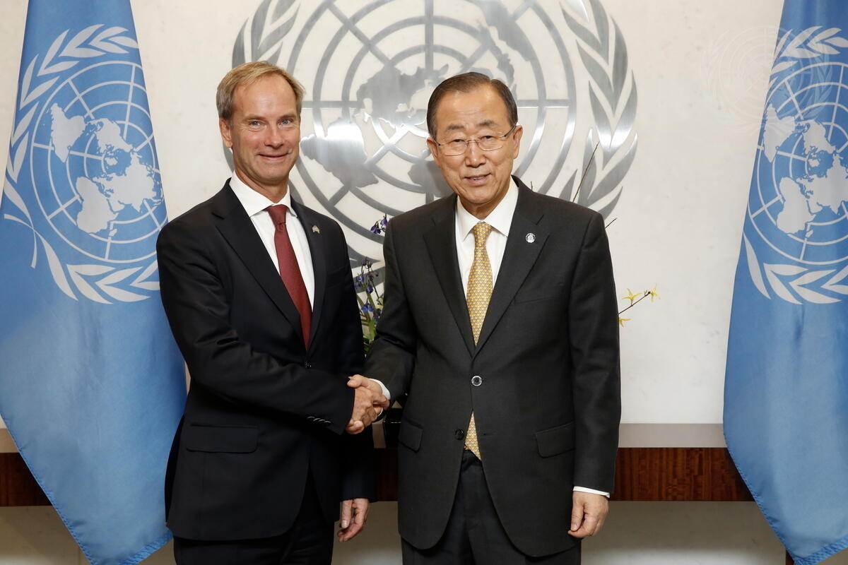Secretary-General Ban Ki-moon (right) meets with Olof Skoog, new Permanent Representative of Sweden to the United Nations.