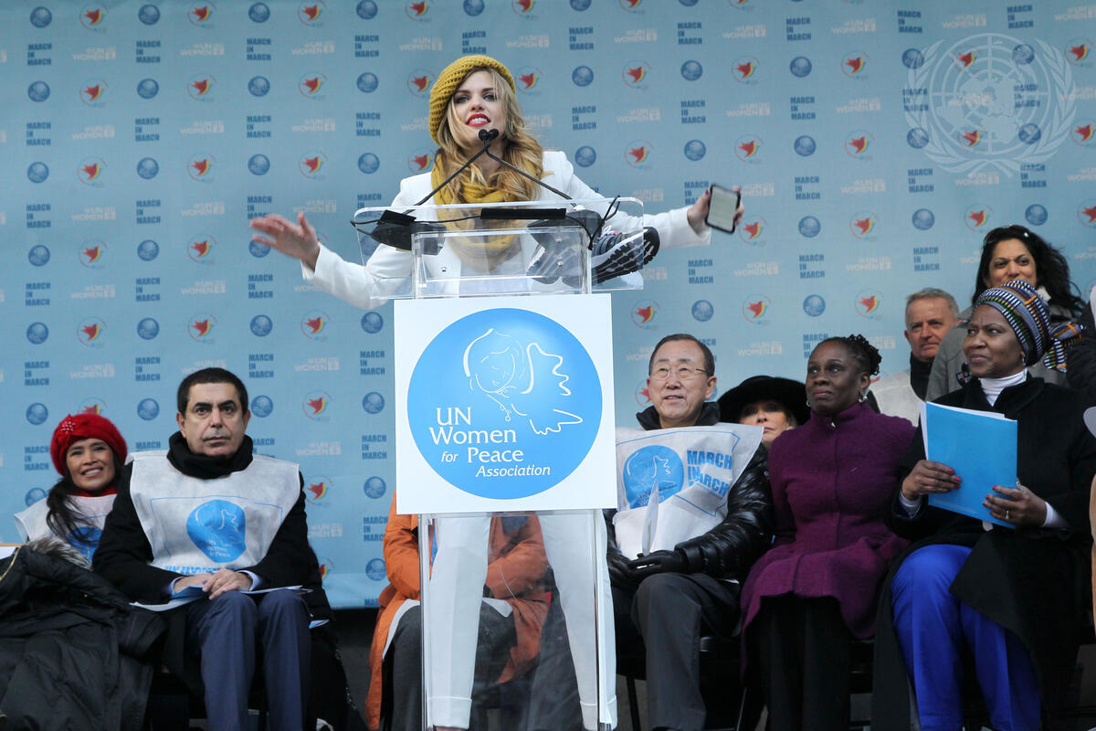 Actress and model AnnaLynne McCord speaks at the kick-off event for the International Women's Day March for Gender Equality and Women's Rights, held in New York City.