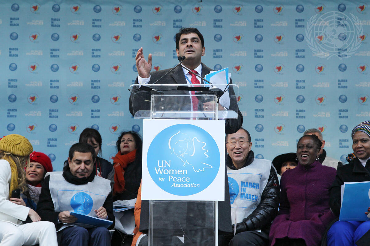 Ravi Karkara, Global Advisor at the the UN Entity for Gender Equality and the Empowerment of Women (UN Women), speaks at the kick-off event for the International Women's Day March for Gender Equality and Women's Rights, held in New York City. Also pictured (from right): Mlambo-Ngcuka, Executive Director of the UN Entity for Gender Equality and the Empowerment of Women (UN Women); Chirlane McCray, First Lady of New York City; Secretary-General Ban Ki-moon; Nassir Abdulaziz Al-Nasser (second from left, front), UN High Representative for the Alliance of Civilizations.
