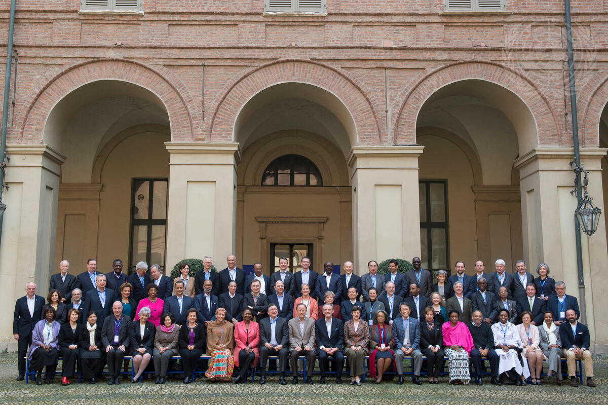 Secretary-General Ban Ki-moon (seated centre) poses for a group photo with participants of a two-day retreat for senior officials of the UN system, organized by the UN College and held in Turin, Italy.
