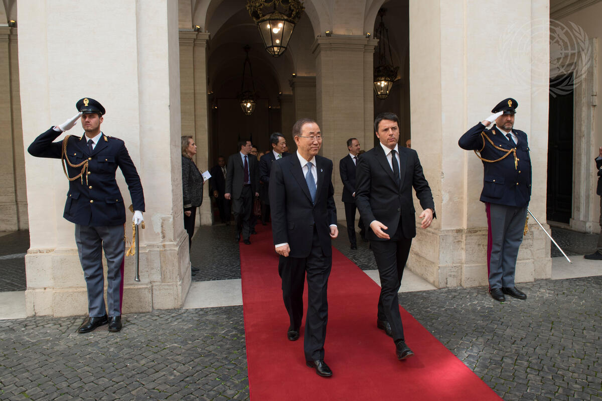 Secretary-General Ban Ki-moon (centre left) meets with Matteo Renzi (centre right), Prime Minister of Italy, in Rome.