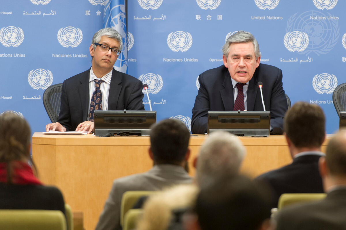 Gordon Brown (top right), United Nations Special Envoy for Global Education, briefs journalists. At his side is Farhan Haq, Deputy Spokesperson for the Secretary-General.