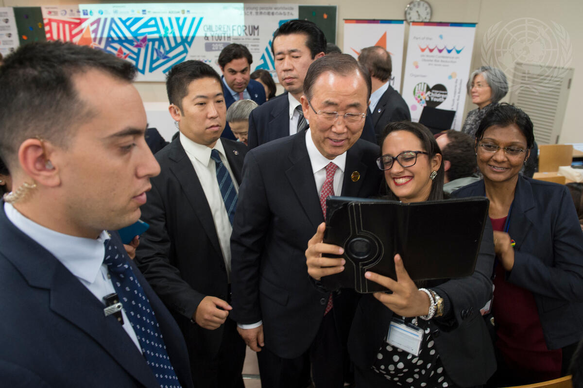 Secretary-General Ban Ki-moon (centre) takes pictures with participants of the Youth Forum in Tohoku University.
