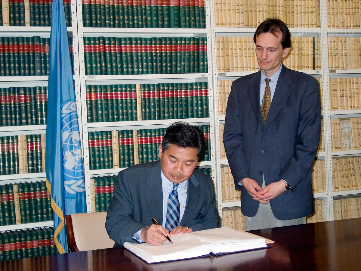 Ambassador Shofry Abdul Ghafor (seated), Permanent Representative of Brunei Darussalam signs the World Health Organization Framework Convention on Tobacco Control..