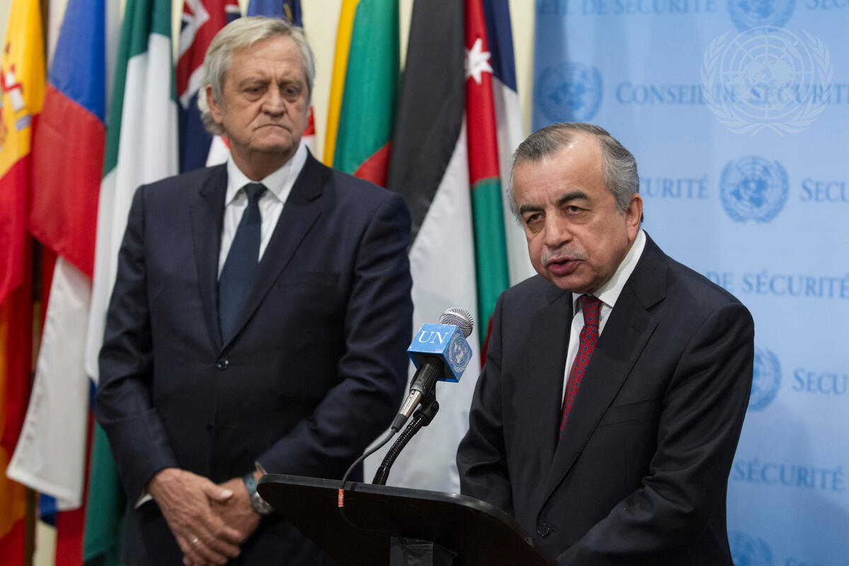 Zahir Tanin (right), Permanent Representative of Afghanistan to the UN, speaks to journalists following a Security Council meeting on the situation in his country and its implications for international peace and security. Also pictured: Nicholas Haysom, Special Representative of the Secretary-General and Head of the United Nations Assistance Mission in Afghanistan (UNAMA).