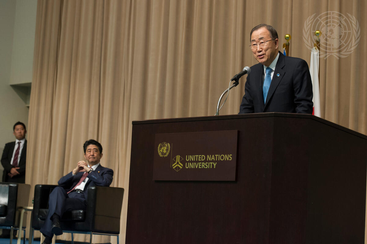 Secretary-General Ban Ki-moon (at podium) speaks at the Symposium on United Nations 70th Anniversary at United Nations University. Sitting on the left is Shinzo Abe, Prime Minister of Japan.
