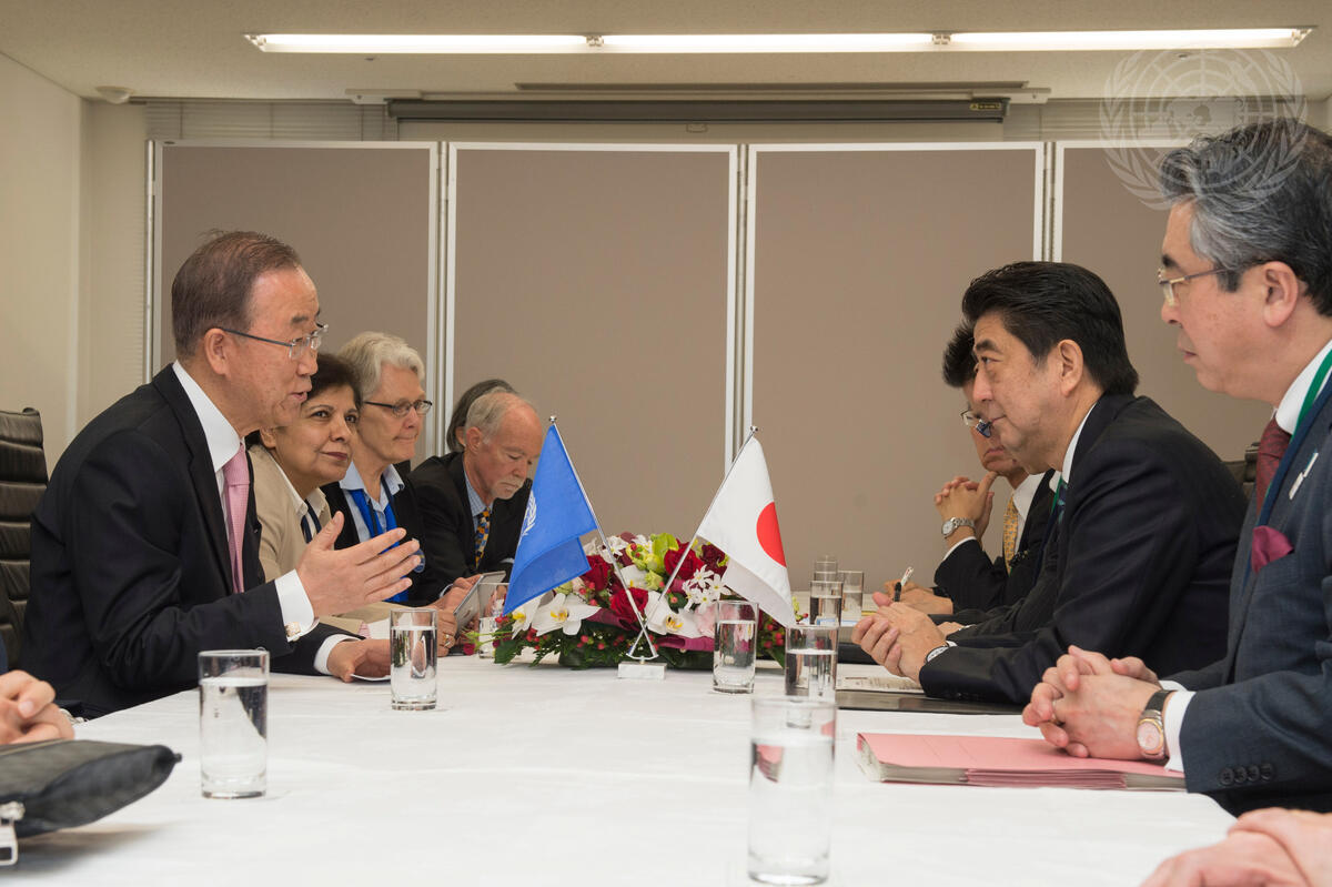 Secretary-General Ban Ki-moon (left) meets with Shinzo Abe (second right), Prime Minister of Japan, at Sendai International Centre.