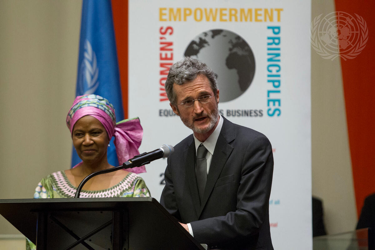 Georg Kell (right), Executive Director of the UN Global Compact, delivers welcoming remarks at the 2015 Women’s Empowerment Principles event, entitled, “Unlimited Potential: Business Partners for Gender Equality”. At his side is Phumzile Mlambo-Ngcuka, Executive Director of the UN Entity for Gender Equality and the Empowerment of Women (UN Women).