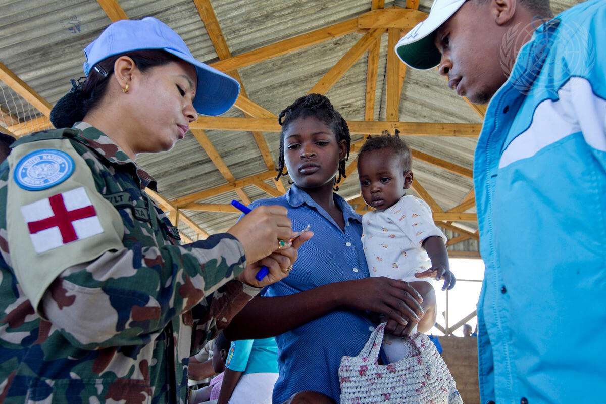 A Nepalese peacekeeper serving with the United Nations Stabilization Mission in Haiti (MINUSTAH) provides medical assistance to residents of Benediction Camp in Port-au-Prince in the aftermath of Tropical Storm Isaac. The storm swept through Haiti on 25 August with high winds and heavy rains, flooding low-lying areas of the capital Port-au-Prince and the south and seriously damaging camps for people displaced by the January 2010 earthquake.