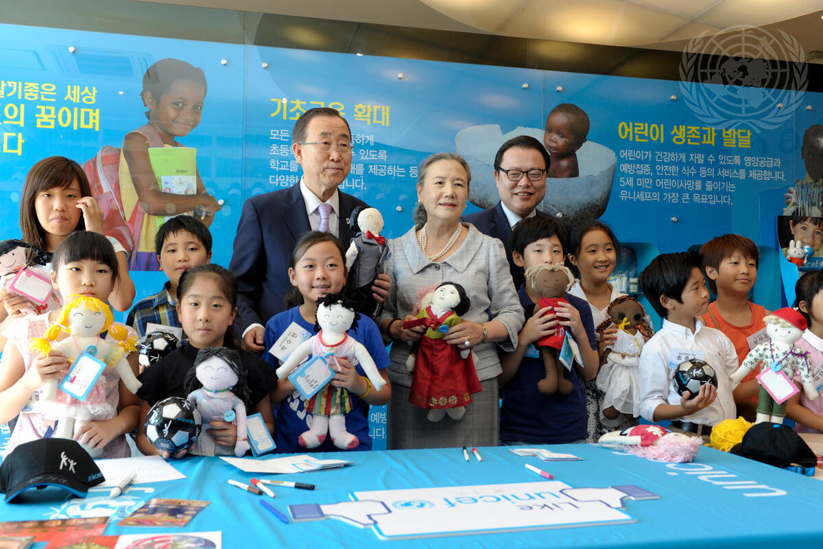 Secretary-General Ban Ki-moon (centre left) visited the Seoul headquarters of the UN Children’s Fund (UNICEF), where he met a number of officials, children and goodwill ambassadors. Mr. Ban was accompanied by his wife, Yoo Soon-taek (centre), on the visit.