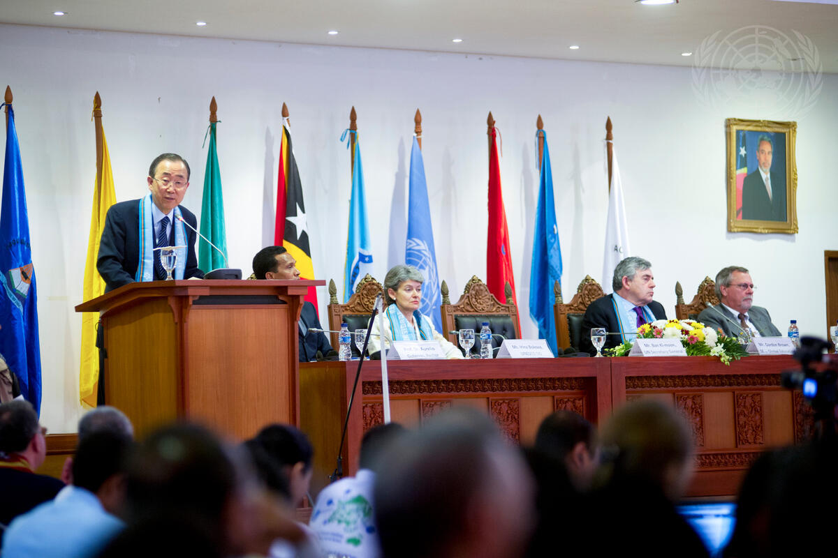 Secretary-General Ban Ki-moon delivers a speech to students of the National University of Timor-Leste on the role of education in nation building. Listening at dais are (from right): Finn Reske-Nielsen, Acting Special Representative of the Secretary-General for Timor-Leste and Head of the U.N. Integrated Mission in Timor-Leste (UNMIT); Gordon Brown, U.N. Special Envoy for Global Education; and Irina Bokova, Director-General of the U.N. Educational, Scientific and Cultural Organization (UNESCO).