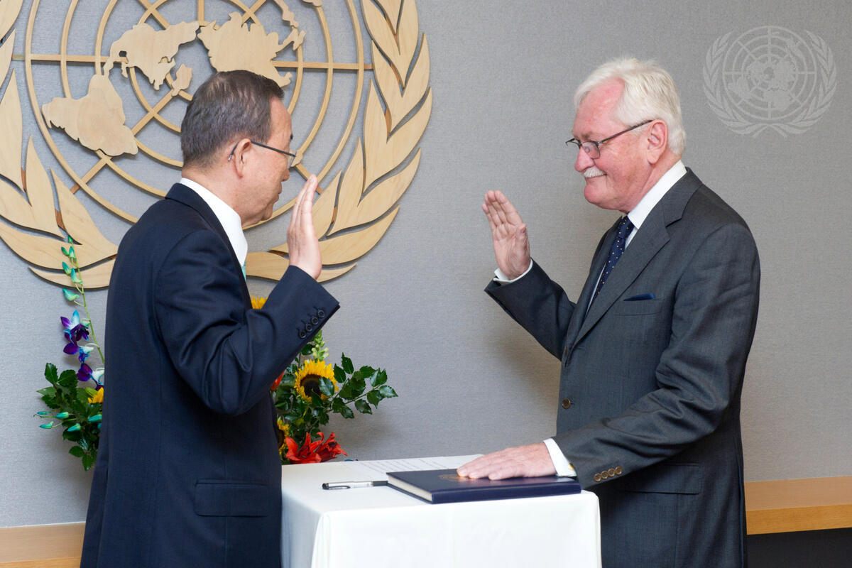 Secretary-General Ban Ki-moon (left) swears in Jean-Jacques Graisse, Acting Head of the Department of General Assembly and Conference Management (DGACM).